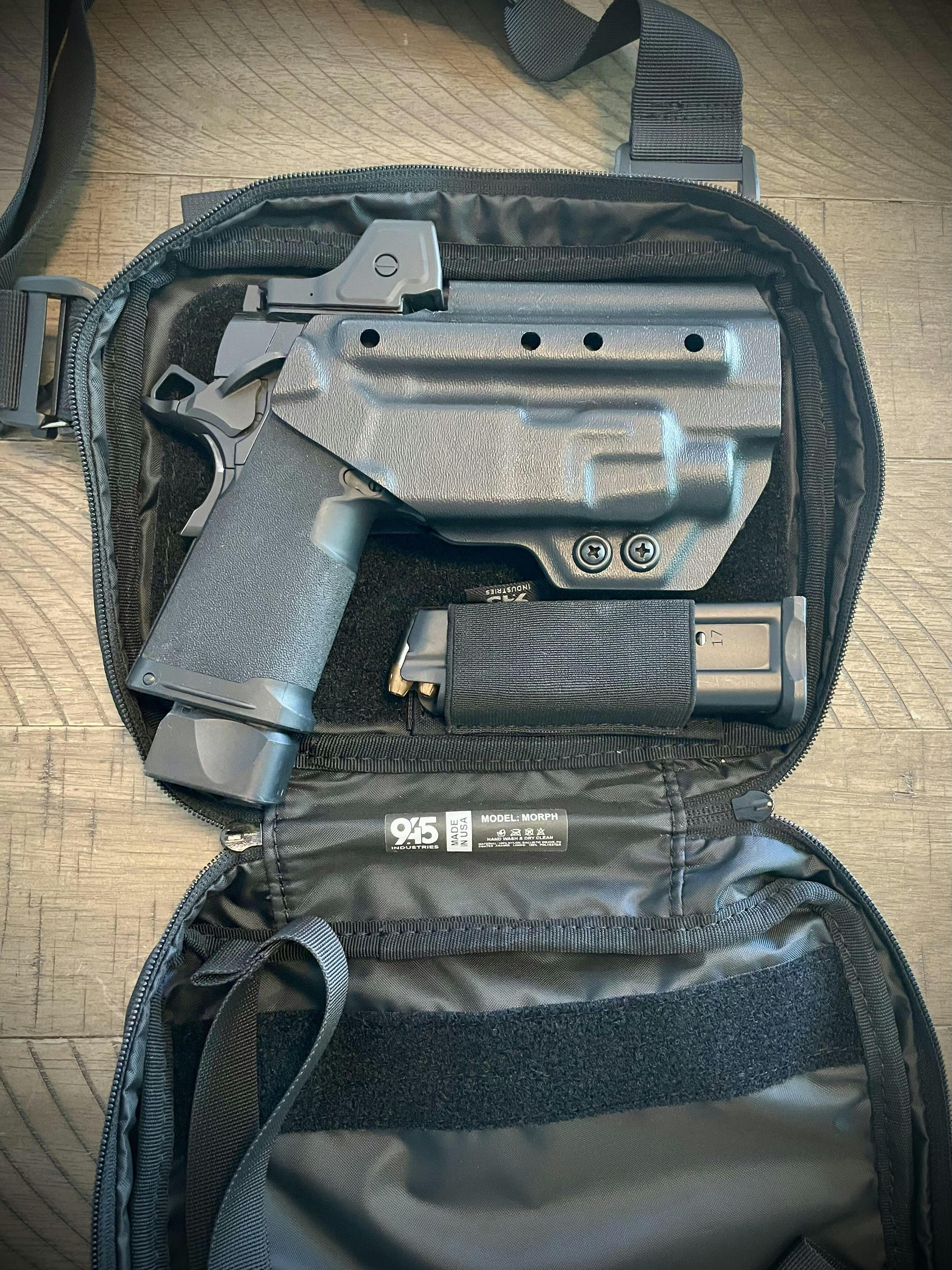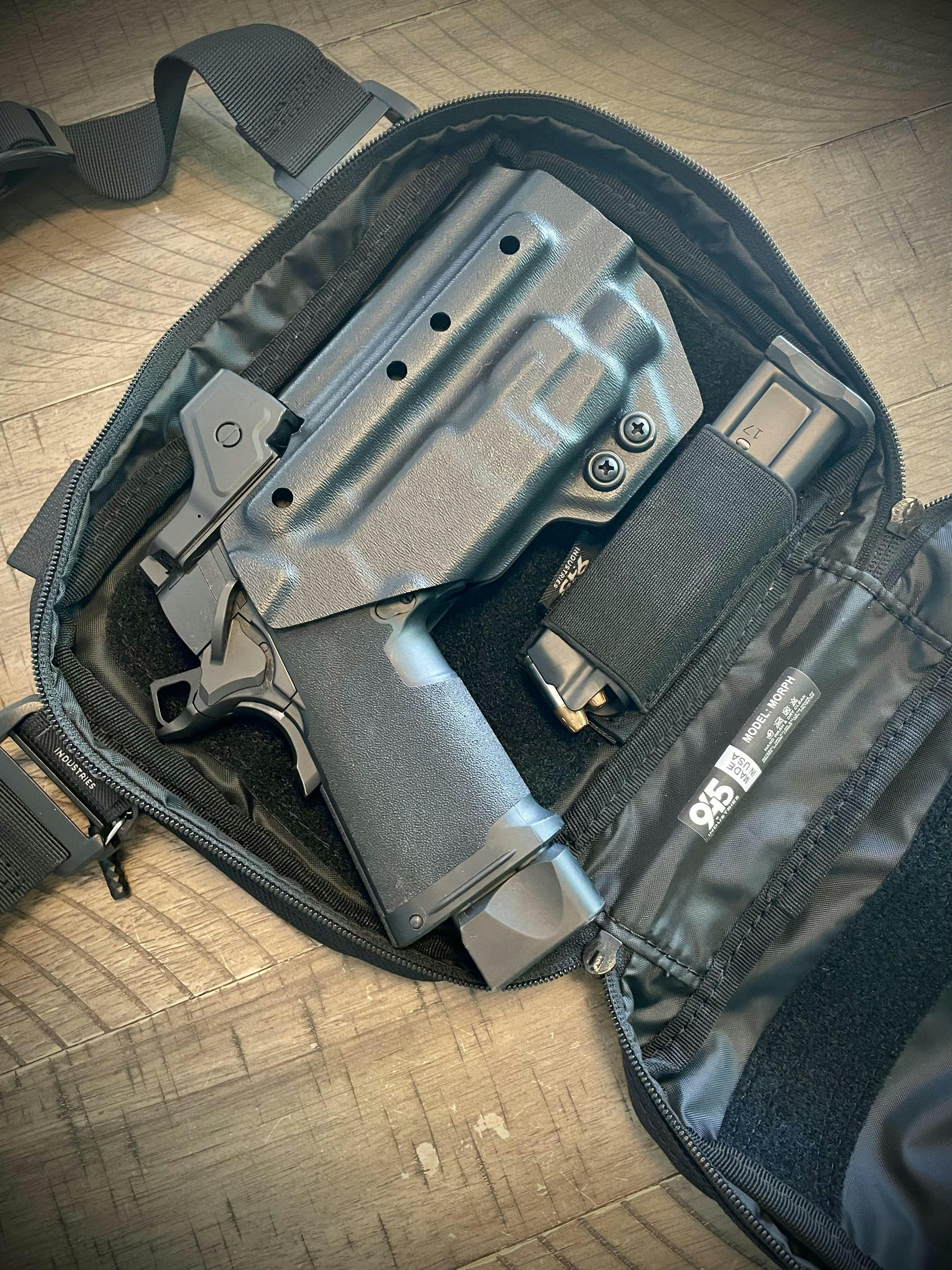 I’ve been using this bag in the sling configuration and absolutely love it. I carry a Glock 45 with a TLR-1X, and it fits perfectly. The zippers open much smoother than on my previous bag. I keep an extra mag, light, knife, and tourniquet in the back pocket, and the front pocket is great for my wallet or other small items. Overall, the quality and build are excellent.
