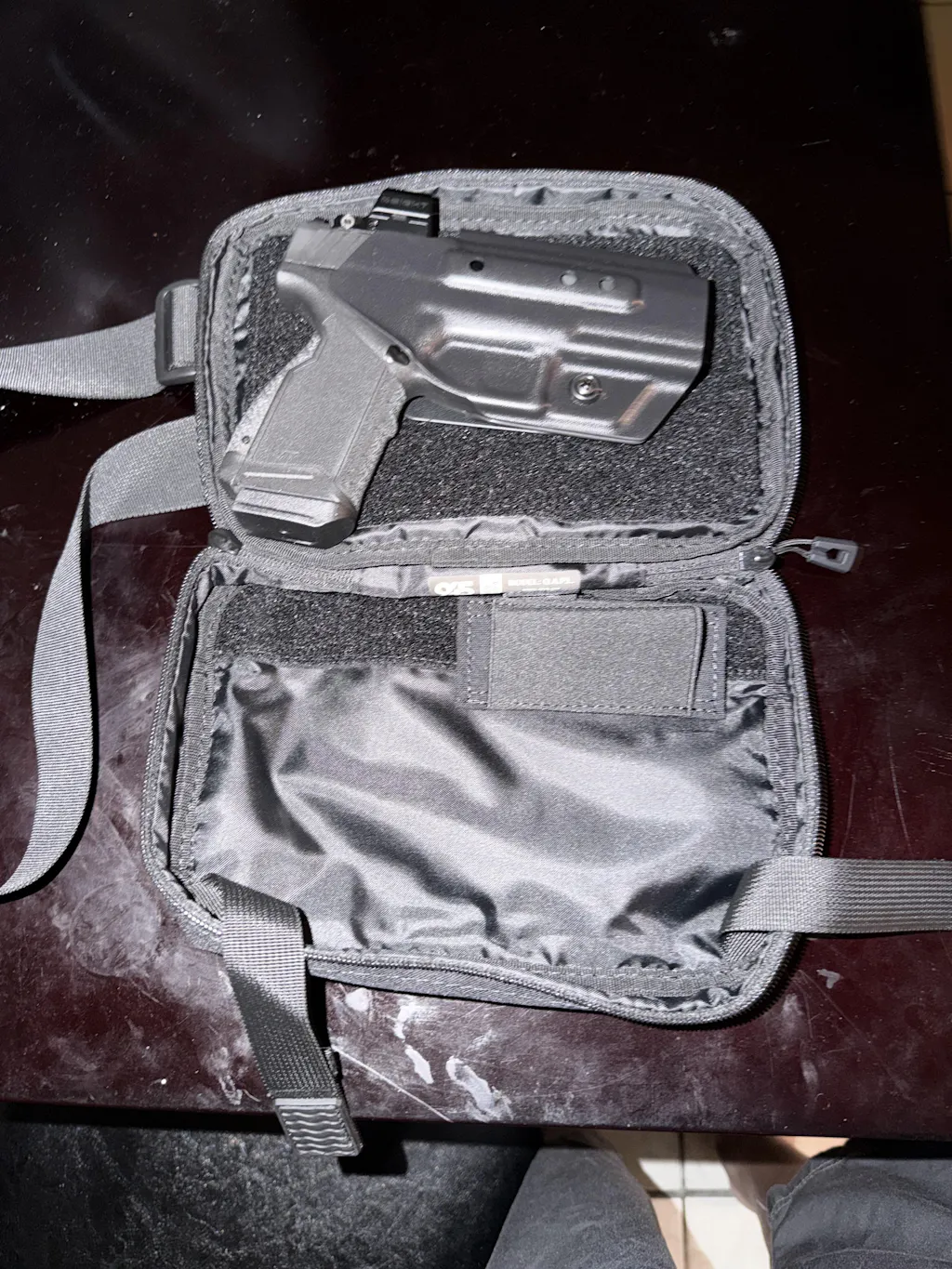 Great off-body carry bag. Fits an M&P Shield+ with low profile red dot optics, as well as an extra magazine in the main ccw pouch. Super clean look and not too overly bulky or loose. Strap is sturdy and wont be easily cut away or pulled off. Quick pull tab and smooth zippers work very well and enable you to access your firearm with ease. The only gripe I have is that the front pocket is soo small, I can barely fit a key fob, chapstick, a card or two. I wish that pocket was slightly larger to enable you to hold a few more items. Overall, excellent carry option and I would recommend it to anyone lookjng for an off-body option.