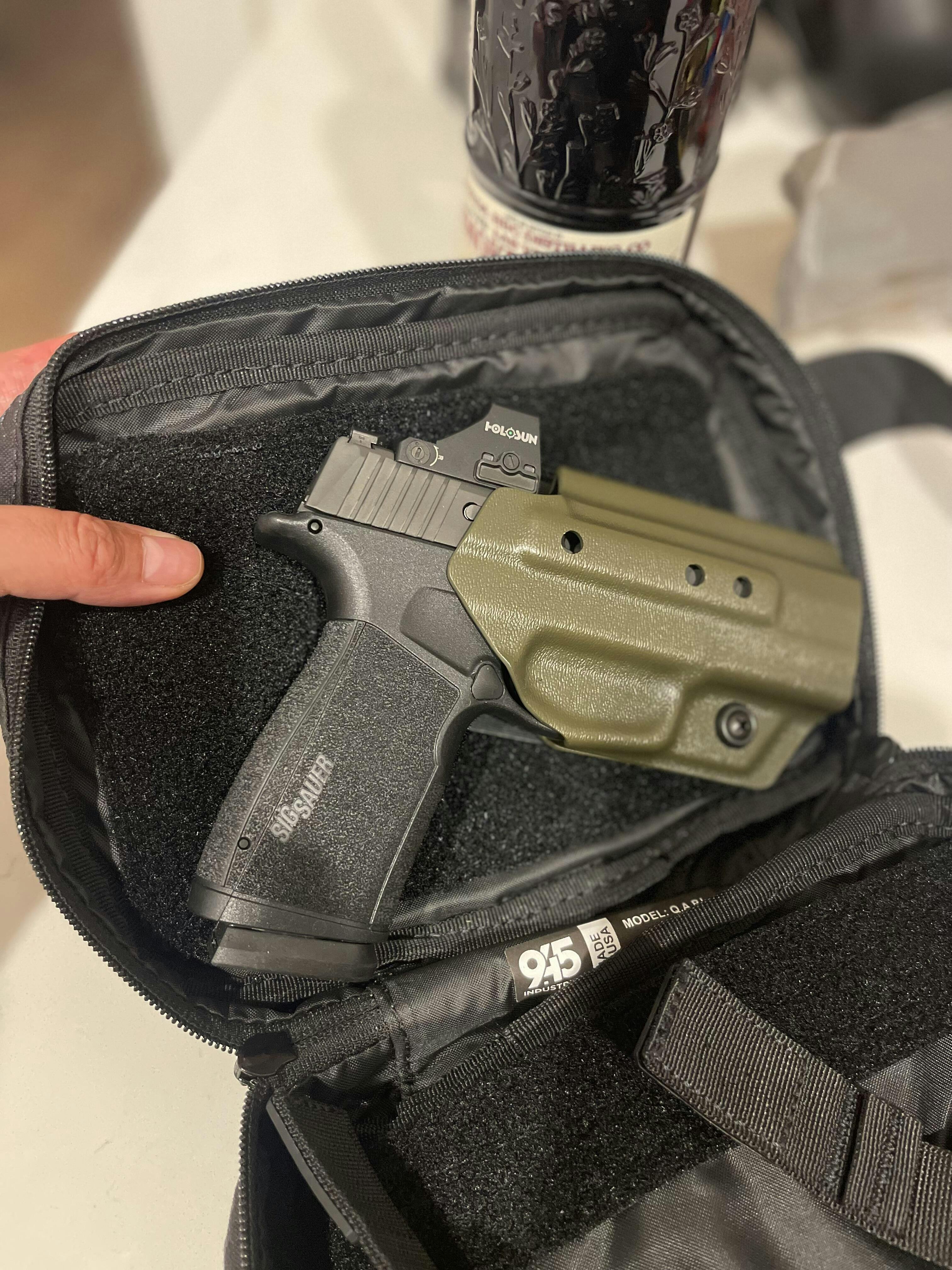 Now I love the bag !! My only complaint is the holster adapter that is now offered. I think the concept is awesome but in my opinion poorly designed. The majority of holster clips are 1.5 inches unless you have a 1.75 inch belt. It’s hard to squeeze the Velcro strap in the holster clip. It’s easier to just put the firearm in the adapter without a holster. Also the holster adapter doesn’t stick to the bag as good as the holster you sell with the Velcro backing. So that we’re clear I LOVE THE BAG!! My problem is with the holster adapter. Maybe you can design the adapter with a piece of kydex in place where the hloster clip secures it nicely and use the same piece of Velcro on your holsters on the back of the holster adapter. Sorry for the idea input. Just brainstorming on how you can make a good accessory better. This is my second bag by the way!!